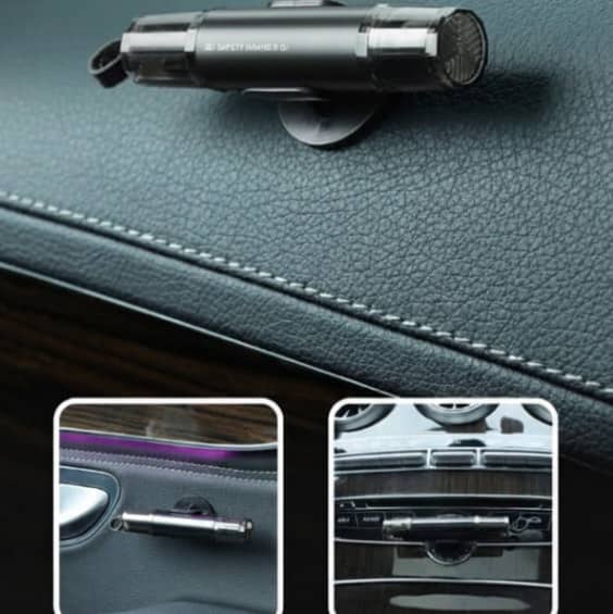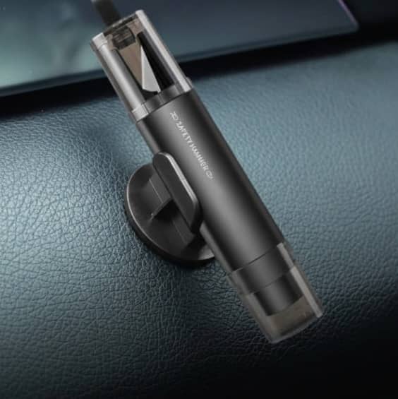 Appuie la pointe sur un coin de vitre latérale → clic → le verre éclate instantanément.🔪 Coupe Ceinture :